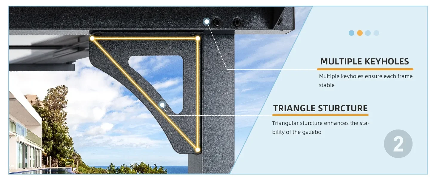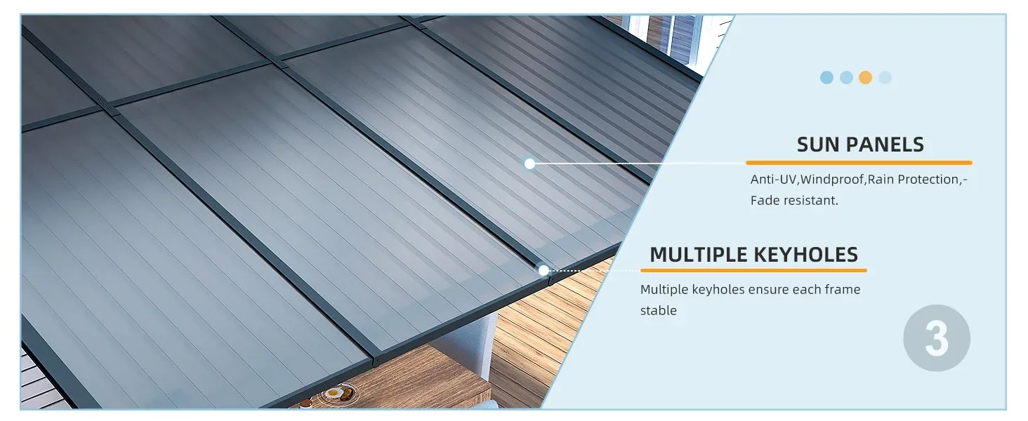 - Comprehensive Protection: The awning roof on top of the pergola provides protection from UV rays and rainwater, covering an area of 140 Sq.Ft.