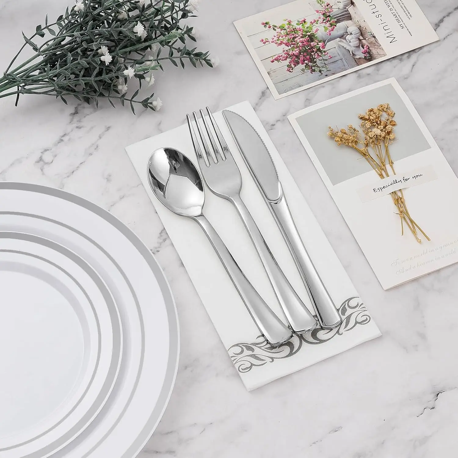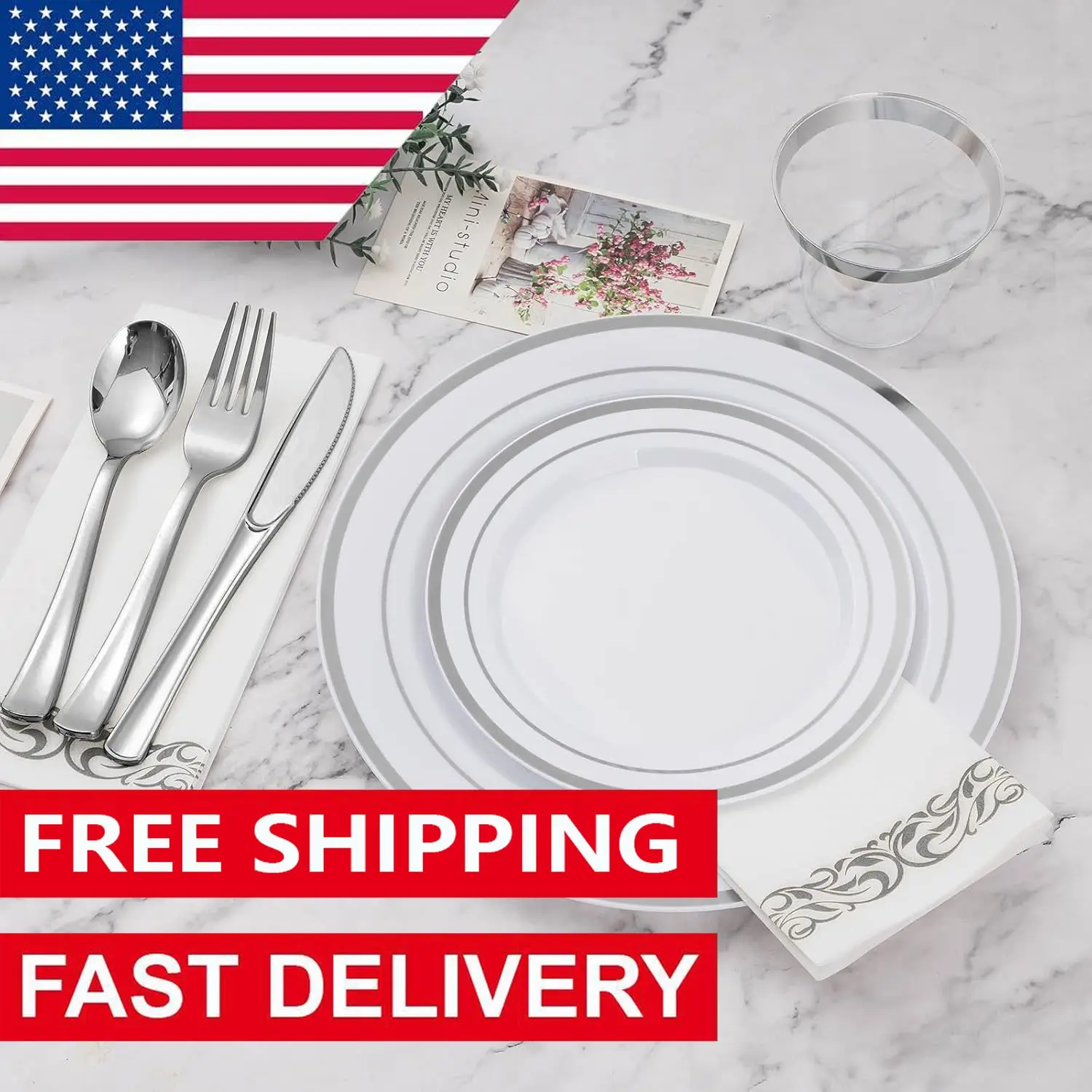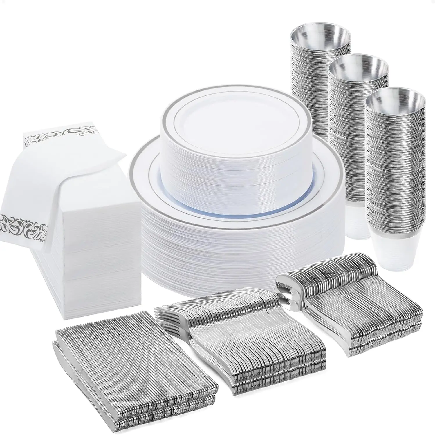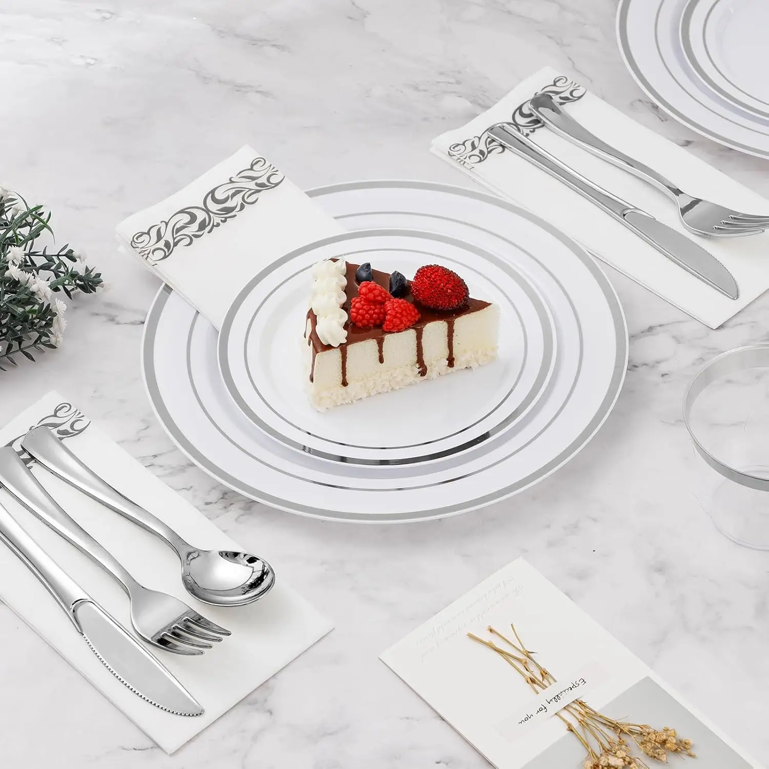 - ELEGANT DESIGN - These disposable plastic plates with a silver rim effortlessly fit into any party, easing planning with their classic color scheme. And these exquisite dinnerware sets elevate the event's refinement and leave lasting, cherished memories for guests.