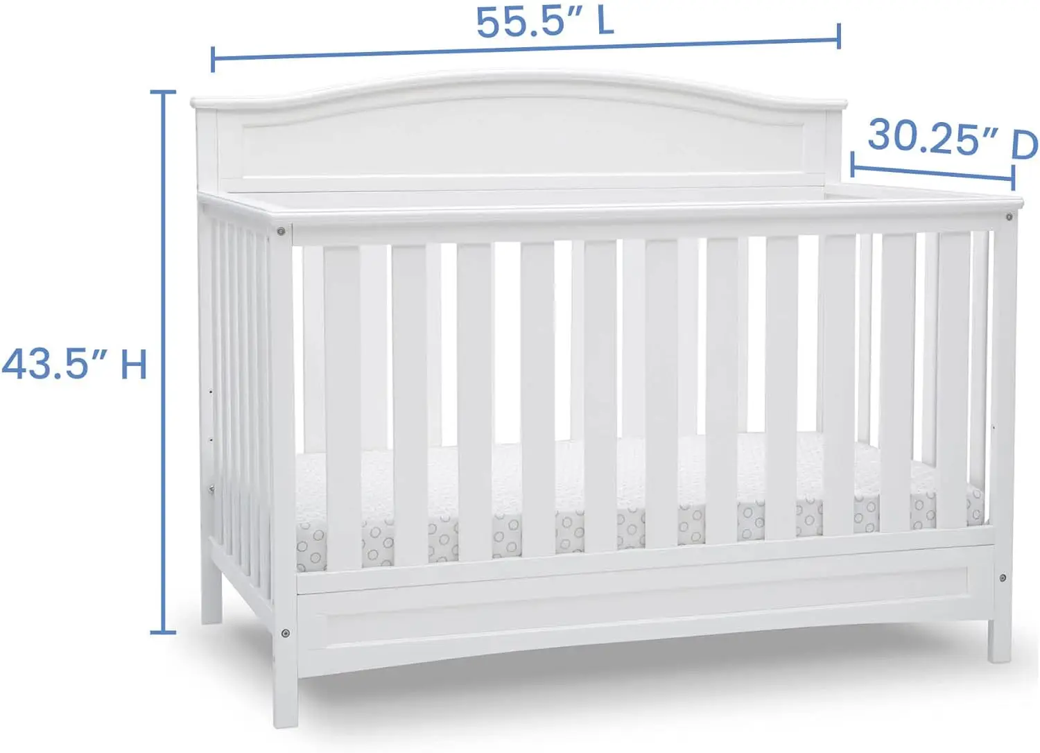 - SIZE: 55.75 W x 30.25 D x 43.75 H Inches. Fits standard size crib mattress (sold separately)