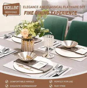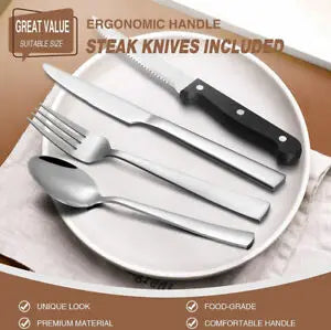 Great QUALITY STAINLESS STEEL: Our silverware set is made of durable food grade stainless steel with no destructive substances, no blurring or chipping, guarantees rust resistance and solid enough for fundamental day to day use for a long time. The mirror cleaned surface generally keep sparkly.