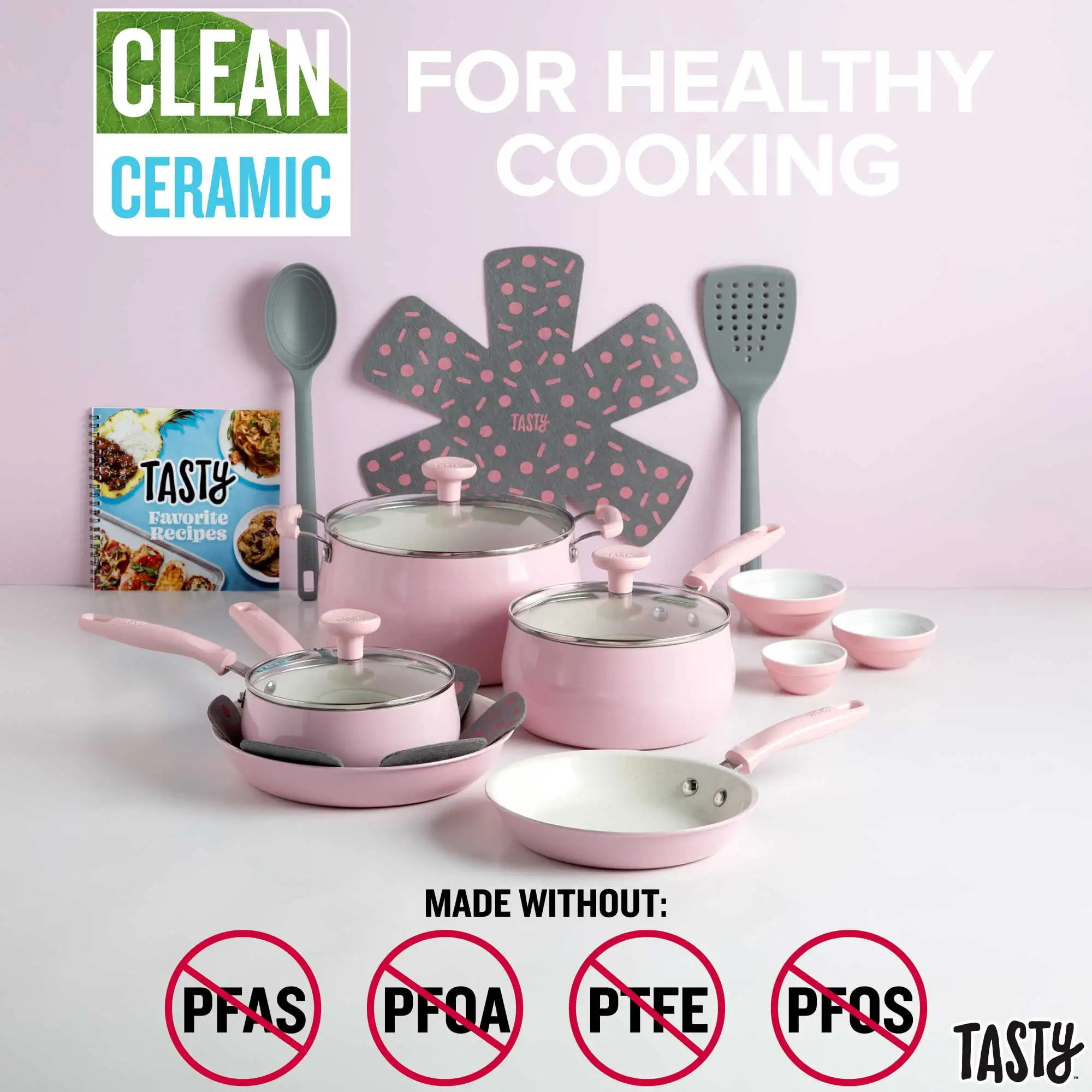 Everything you need for your kitchen in one box! Set your kitchen up for success with this Tasty Clean Ceramic non-stick 16 piece cookware set. The better, stronger, and longer-lasting reinforced Clean Ceramic non-stick coating allows food to easily slide out of the pan. The non-stick coating is made without PFAS, PFOA, PTFE and PFOS for healthy cooking. When you're looking to store these pots and pans, use the included pan protectors to sandwich in between two pieces of cookware to allow for stacking and storing without scratching. The cookware also features a stainless steel induction base, making this cookware suitable for all cooking surfaces, including induction, electric, gas and glass.