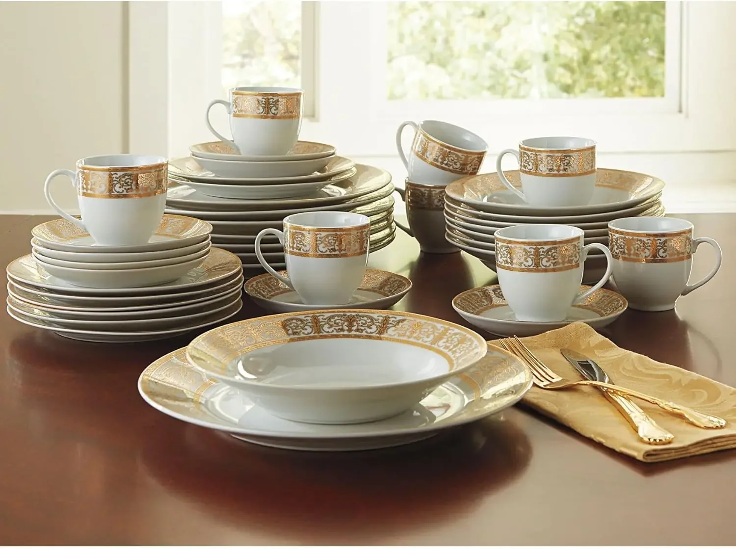 - Elegant porcelain dinnerware set with a classic goldtone border motif.