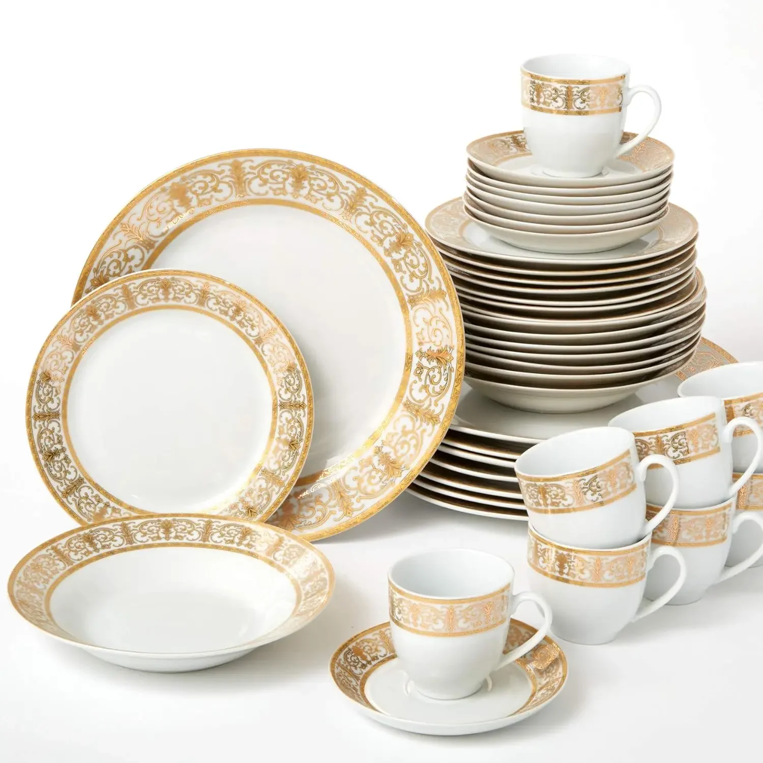 Ceramic Tableware Set 40-Piece Premium Golden Porcelain Dinnerware, Service For 8 Gold White