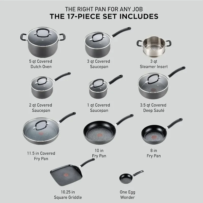 - Set includes: 8 inch fry pan, 10 inch fry pan, 11.5 inch fry pan with lid, 10.25 inch square griddle, 1 quart saucepan with lid, 2 quart saucepan with lid, 3 quart saucepan with lid, 5 quart dutch oven with lid, and 3 quart steamer insert with 2 side handles.