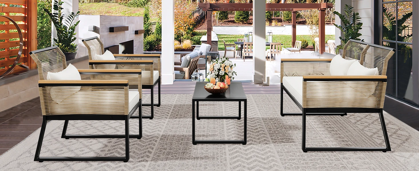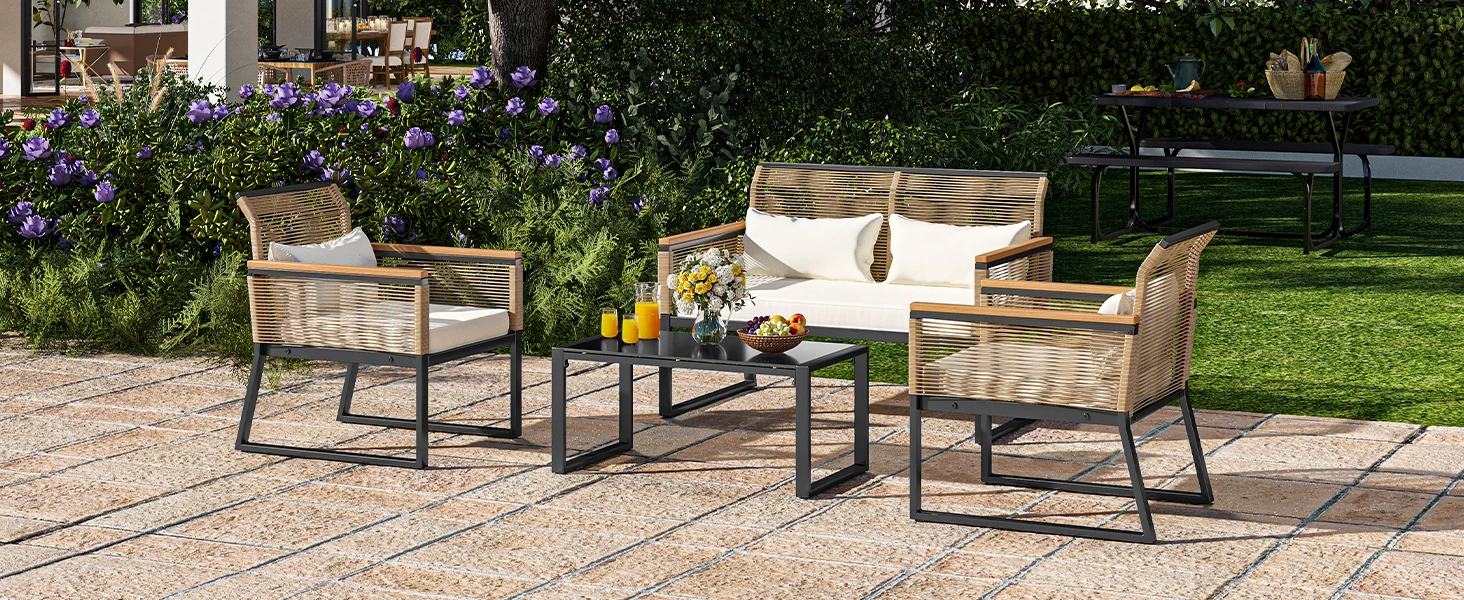 - MODULAR PATIO SETS: The woven rattan sofa stands out with mixed colored armrests - natural wood and black materials harmonize with rattan design; A stylish set of table and loveseat chairs to bring richness to your living room, porch, courtyard, and poolside